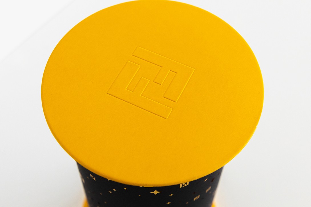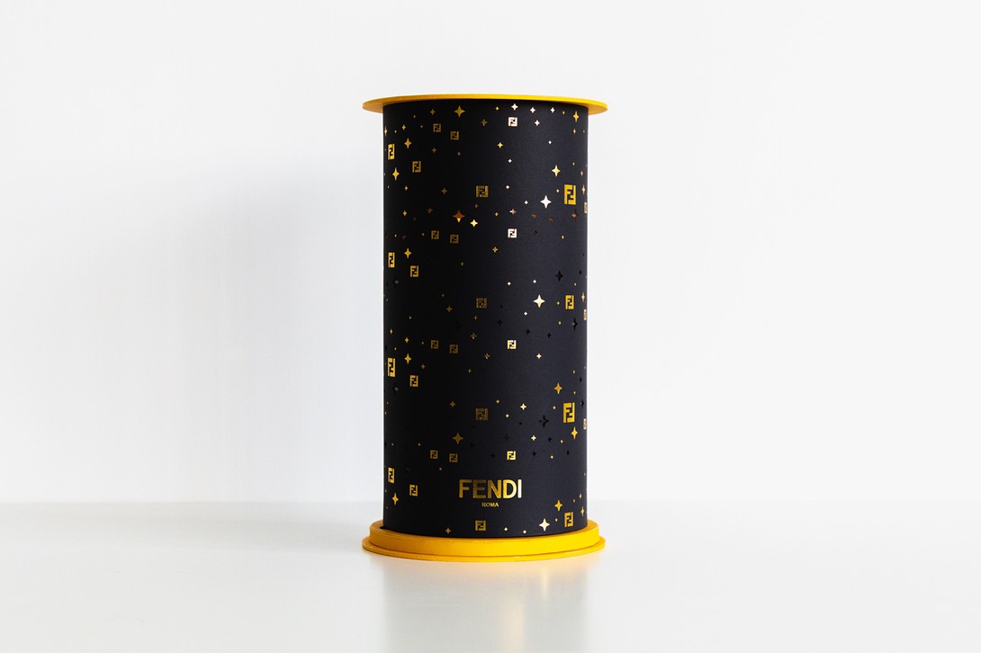 Hộp bánh hình trụ của Fendi mang tông đen – vàng thanh lịch, bên trong chứa bốn chiếc bánh Trung Thu vị socola được xếp gọn gàng.