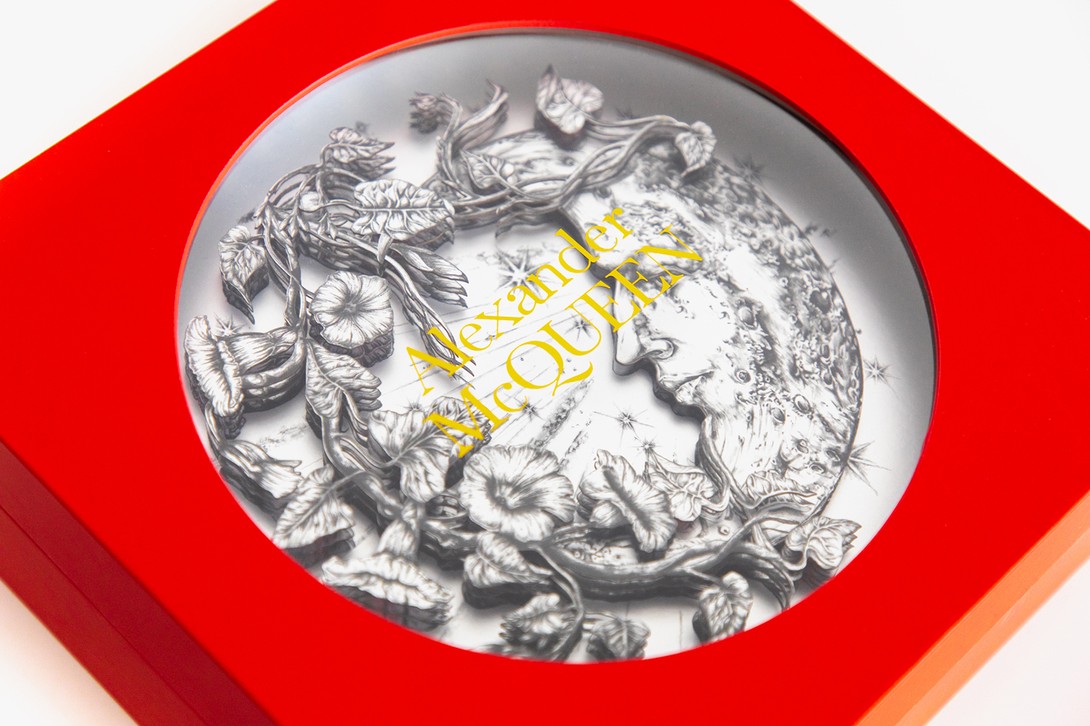 Chiếc hộp đỏ rực rỡ của Alexander McQueen nổi bật với họa tiết tinh xảo — hình ảnh nửa vầng trăng hòa quyện cùng hoa lá và cành cây, tạo nên một thiết kế vừa rực lửa vừa lãng mạn.
