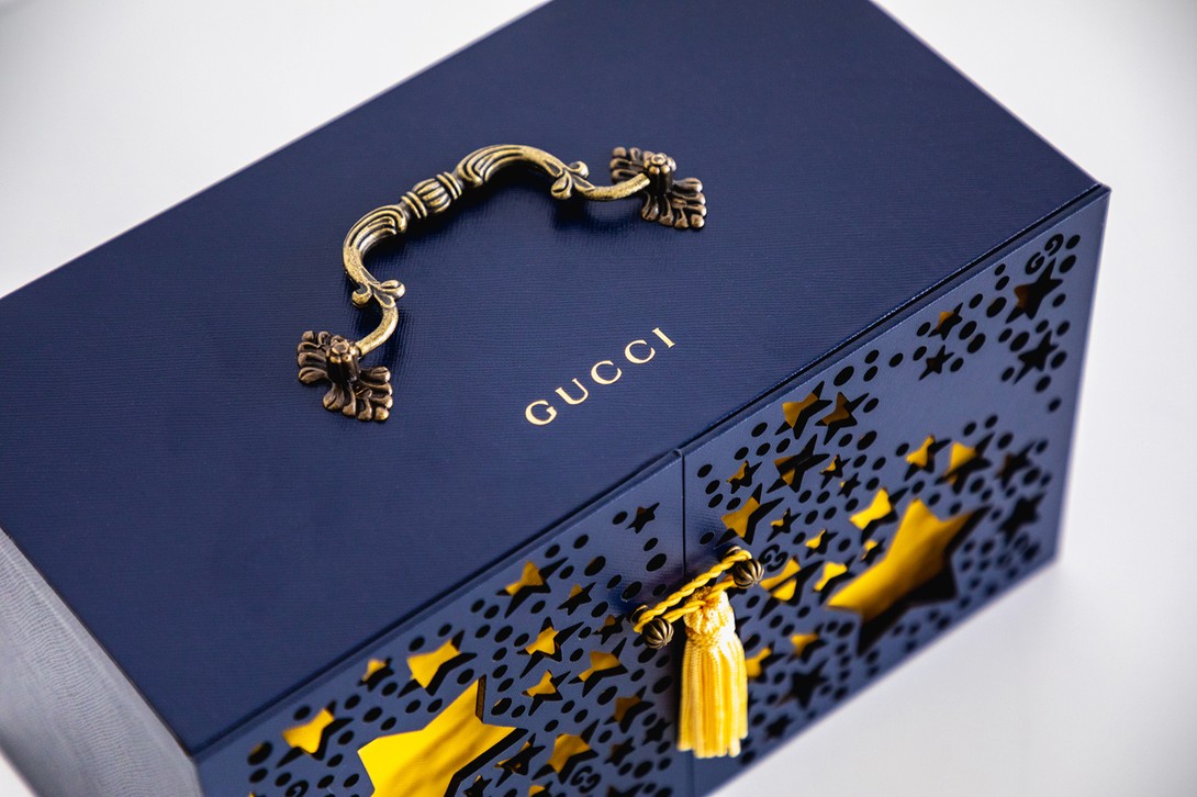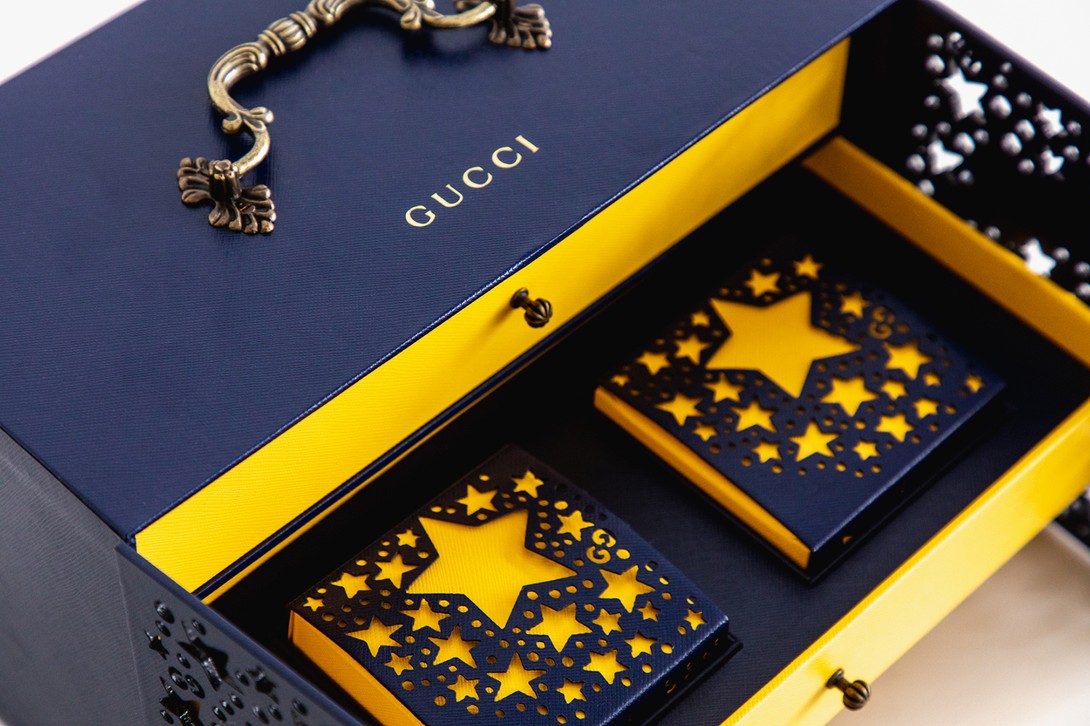 Lấy cảm hứng từ hộp đựng thực phẩm cổ của Trung Hoa, hộp bánh Trung Thu của Gucci có tay cầm bằng kim loại chạm khắc cầu kỳ, cửa đóng mở tinh xảo. Đặc biệt, hộp còn đi kèm lư hương hình thỏ bằng kim loại và nhang thơm – truyền thống phổ biến trong những buổi tụ họp mùa trung thu.