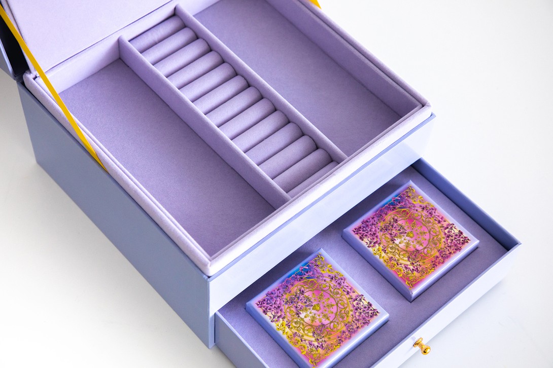 Chiếc hộp màu tím pastel của Versace không chỉ chứa đựng những chiếc bánh Trung Thu thơm ngon, mà còn được thiết kế như một hộp nữ trang với các ngăn đựng nhẫn và hai khoang rộng để lưu trữ trang sức.