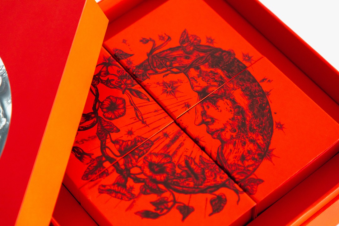 Highlight pieces include Alexander McQueen‘s fiery red box that boasts an intricate design of a half crescent moon merging with flowers and stems.